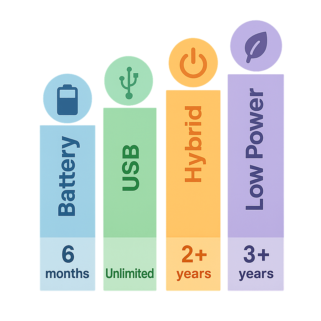Power management significantly impacts both functionality and long-term maintenance requirements of entry monitoring systems. Battery-powered sensors offer installation flexibility but require periodic replacement, whilst USB-powered options provide continuous operation and can serve as network repeaters to strengthen mesh networks.