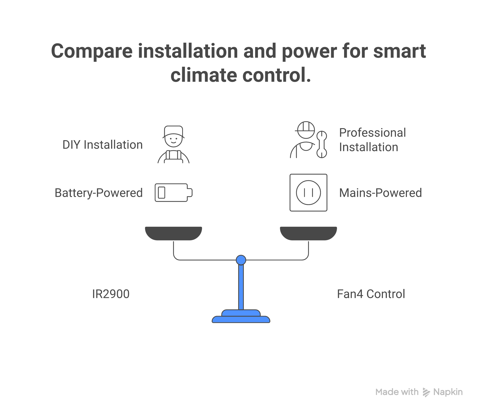 Technical comfort levels significantly influence installation success, with the IR2900 suited to confident DIY users whilst the Fan4 Control requires electrical expertise for safe AC mains connections. Consider your technical abilities and local electrical regulations when evaluating installation approaches for achieving the best ac temperature control in your specific environment.