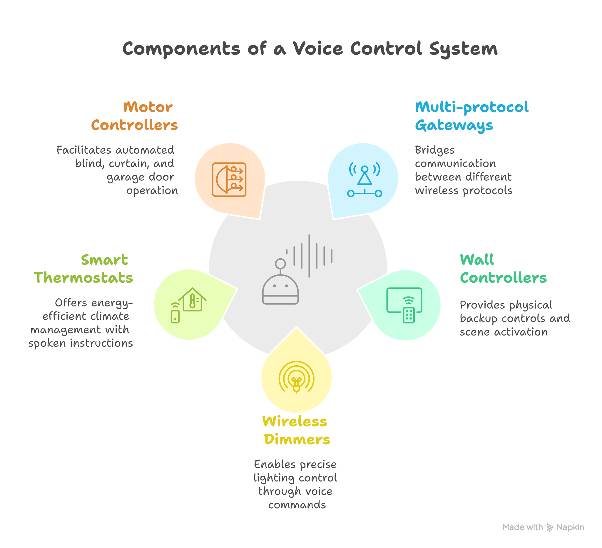 Each component contributes unique capabilities to the voice control ecosystem, from basic on-off functions to sophisticated environmental management. Quality components ensure reliable responses to voice commands whilst providing manual override options for situations where voice control may not be practical or available.
