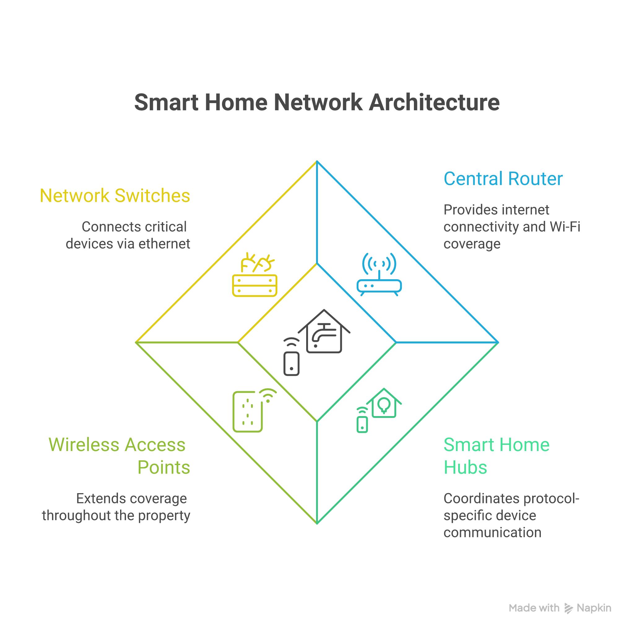 • Central router providing internet connectivity and Wi-Fi coverage