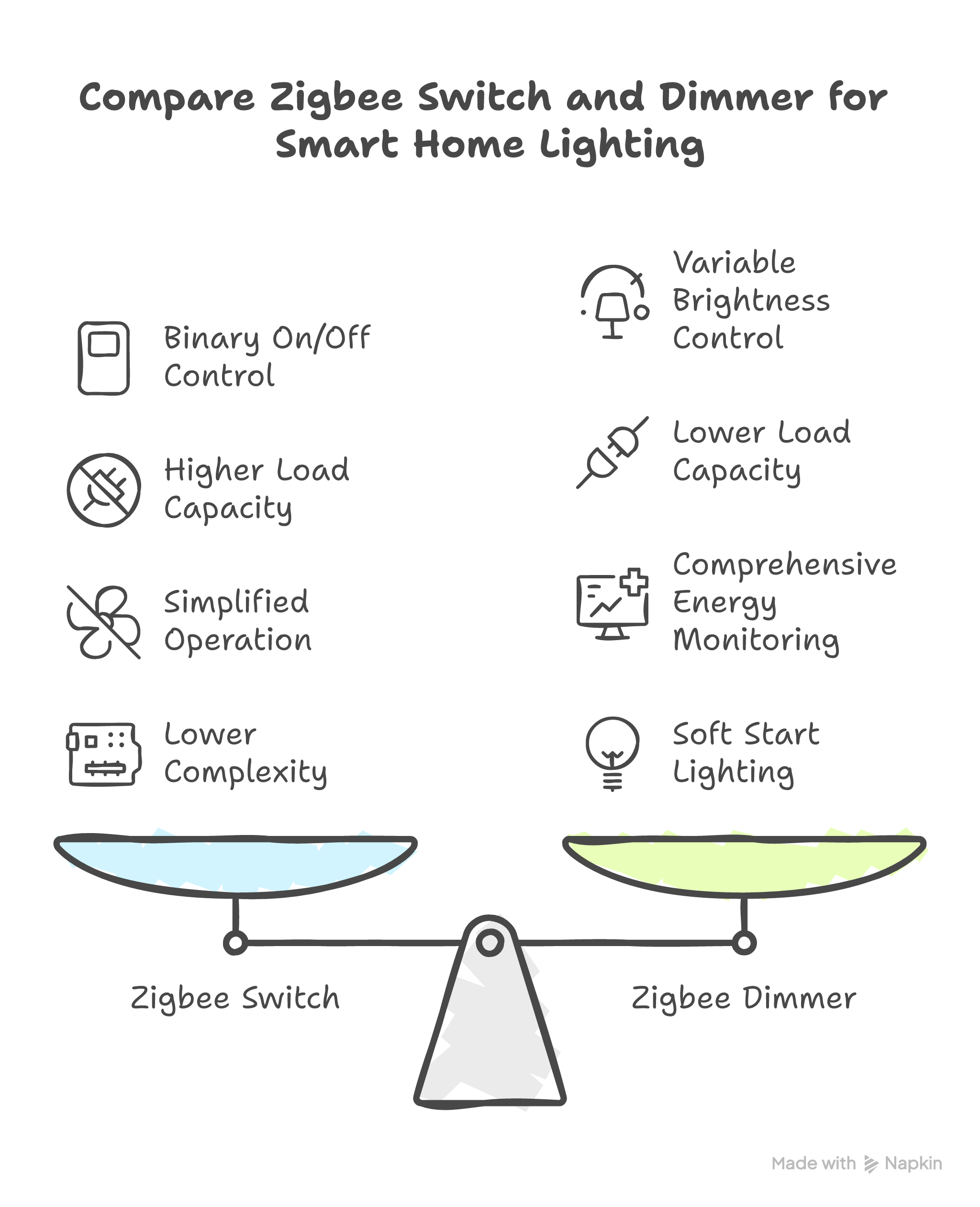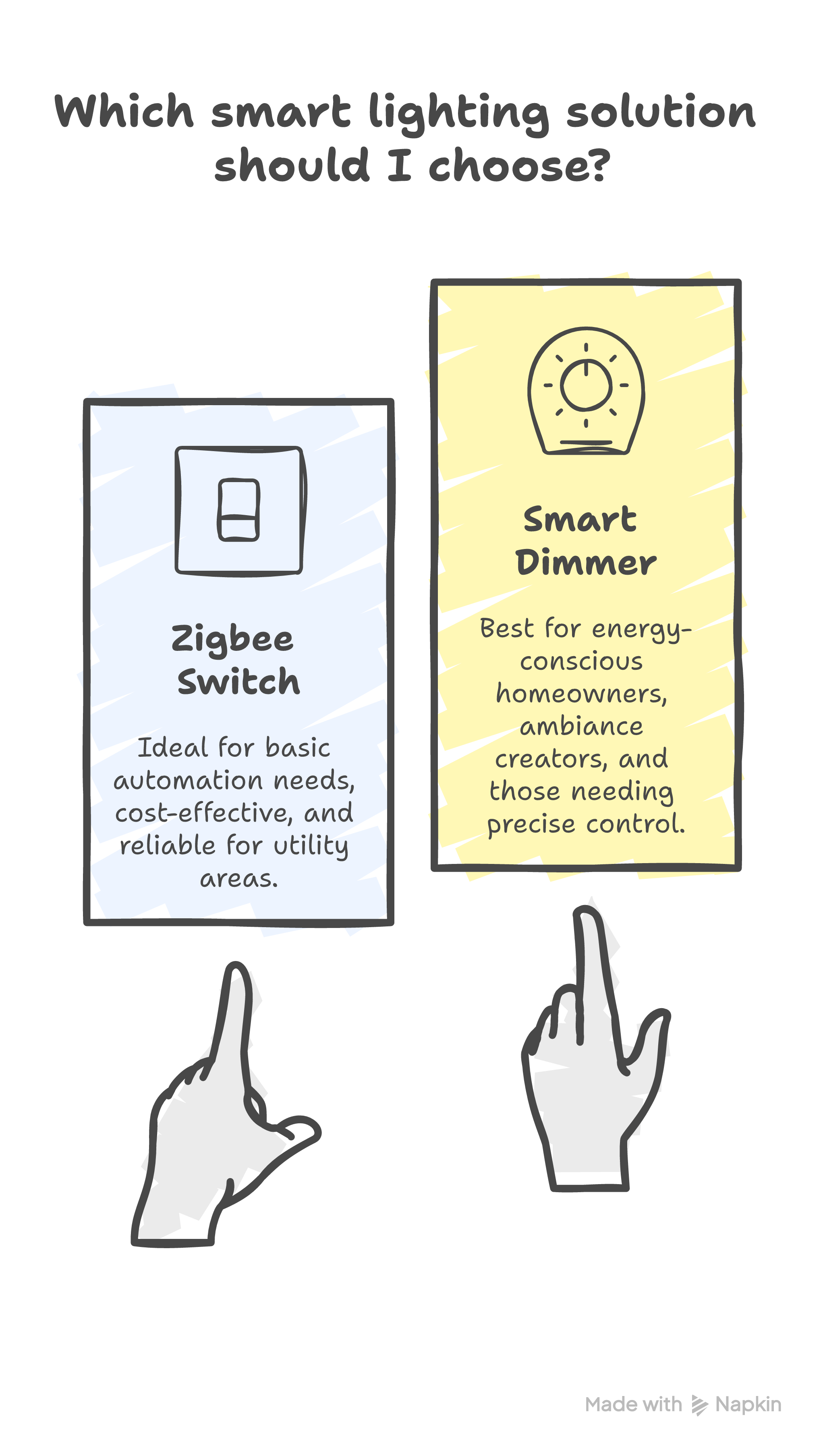 Choosing between these devices depends largely on your specific home control requirements and long-term smart home automation goals. Basic automation seekers who primarily need reliable on/off control for utility areas, garages, or outdoor lighting will find the Zigbee Switch delivers excellent value without unnecessary complexity.
