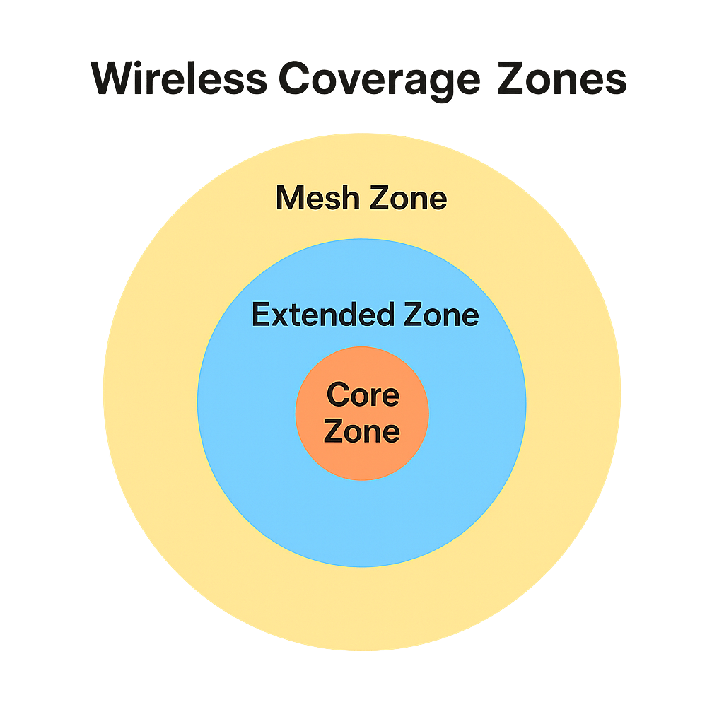 - Mesh node positioning creating overlapping coverage zones for seamless connectivity