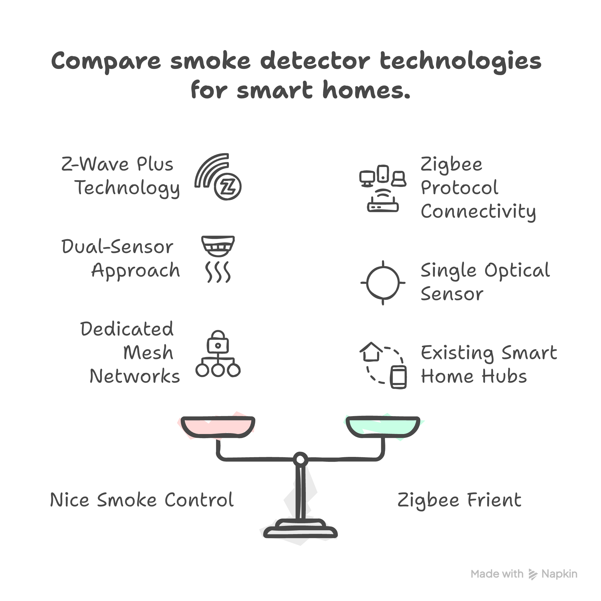 This comparison will help you choose between Z-Wave and Zigbee smoke detection technologies, examining which sensor offers better integration, features, and reliability for your smart home setup. We'll evaluate both the advanced Nice Smoke Control and the streamlined Zigbee Frient to determine which suits different monitoring needs.