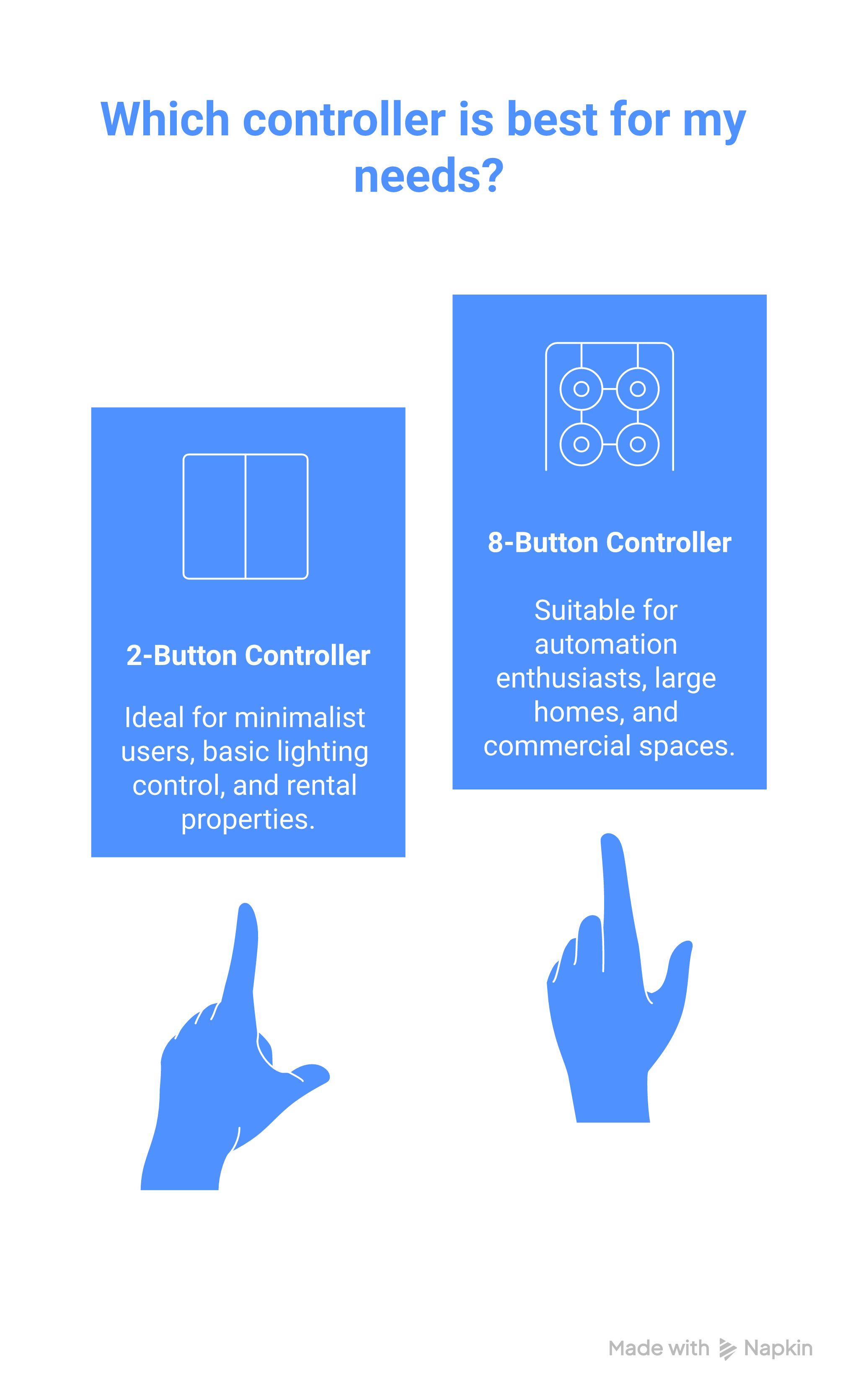 The 2-button controller excels in situations where simplicity and cost-effectiveness take priority. Its streamlined design reduces complexity whilst providing essential scene control functionality that covers most common home automation scenarios.