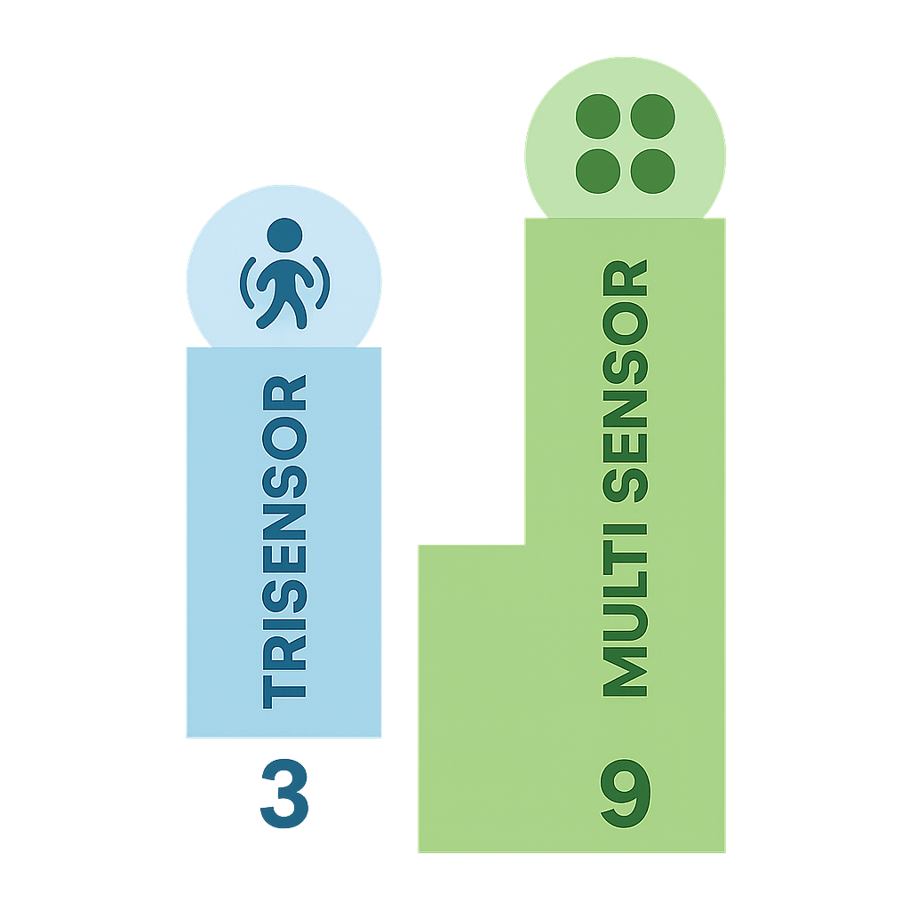 - Motion detection range: TriSensor covers 7.5 metres, Multi Sensor provides similar coverage with additional accuracy data