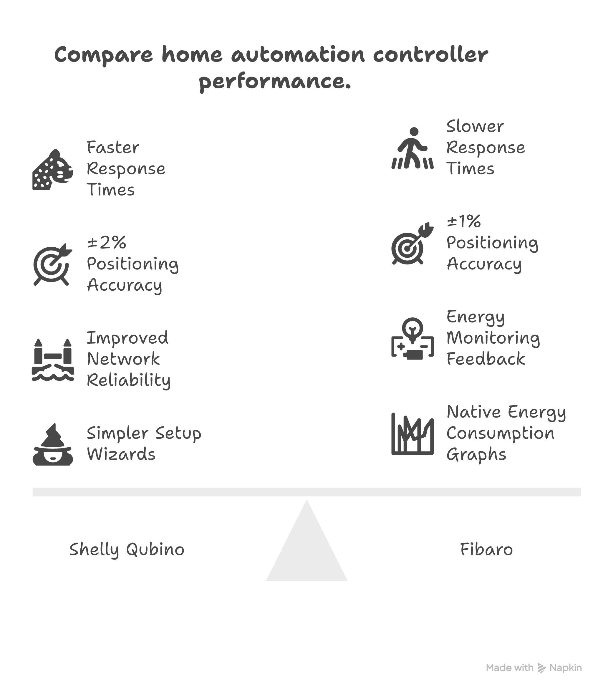 Daily usage reveals distinct performance characteristics between these controllers. The Shelly Qubino's S800 chip delivers notably faster response times, with commands executed within 200-300 milliseconds compared to the Fibaro's 400-500 millisecond response window. This difference becomes apparent when controlling multiple blind or shutter groups simultaneously.