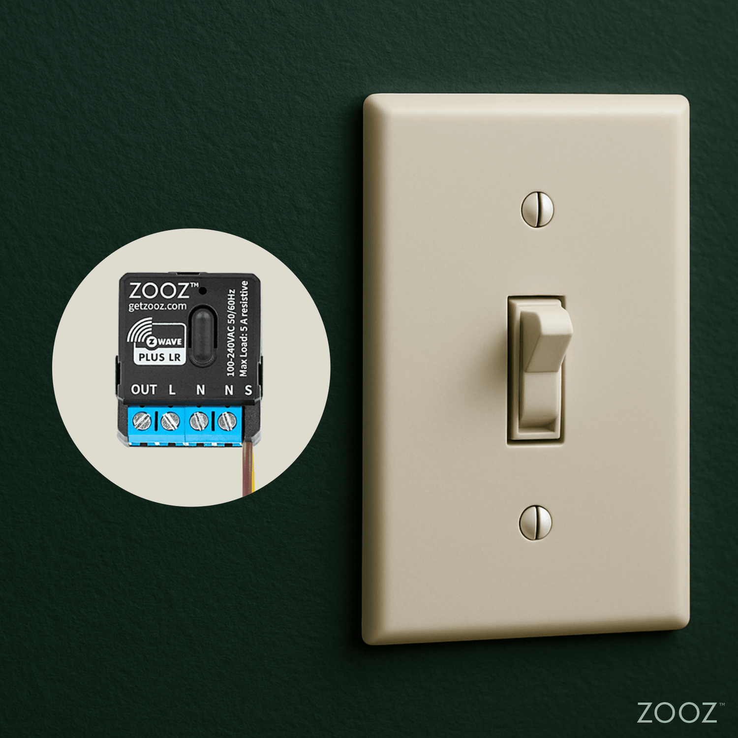 Firmware updates may be required, and some features might not be available on your hub. This device provides on/off Z-Wave control for 100–240 V lights up to 5 A, a dry contact switch for wall control (no voltage on input), and supports SmartStart, S2 security, scene control, smart bulb mode, and quality LED bulbs. It features a Z-Wave 800 Series chip with Long Range, a multicolor LED indicator, and a built-in signal repeater. Requires a Z-Wave hub (sold separately) and includes a 5-year warranty with lifetime tech support.