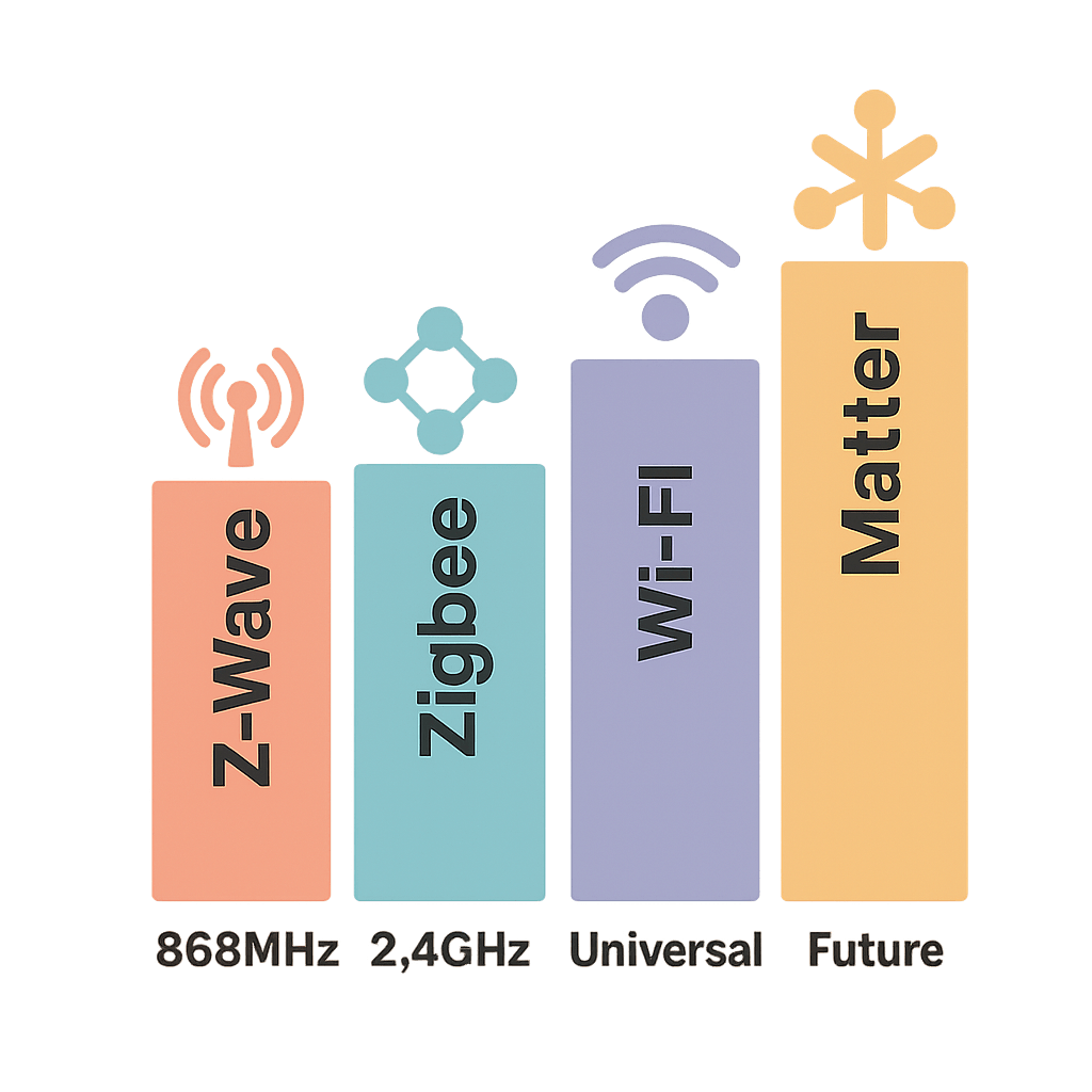 • Z-Wave: Superior range, lower device limits, excellent for larger properties