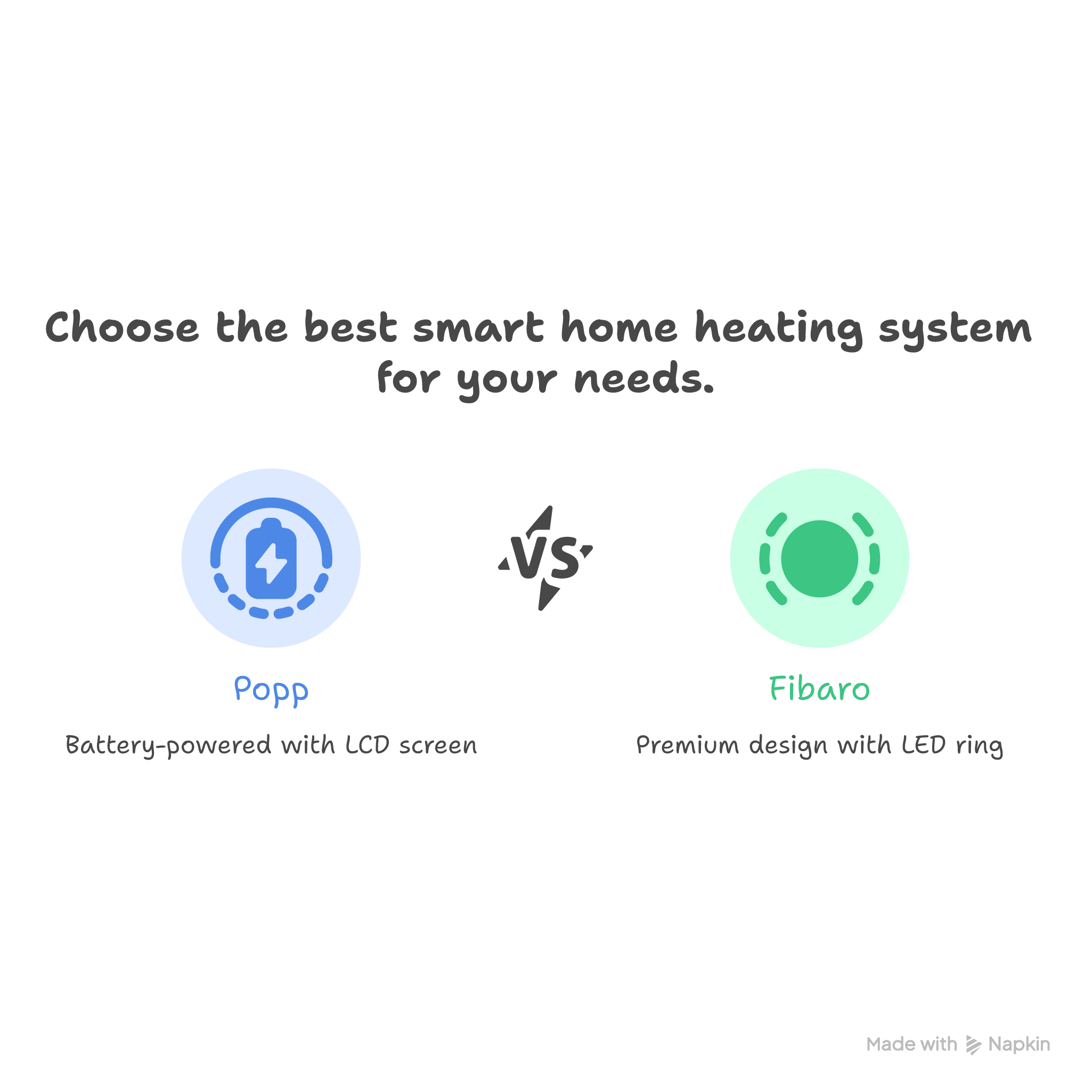 The Popp excels with its quiet operation, extended battery life, and straightforward Zigbee integration, making it ideal for users seeking reliable, no-fuss heating control. Meanwhile, the Fibaro stands out with its premium design, visual feedback system, and advanced Z-Wave features, perfect for those wanting cutting-edge heating technology.